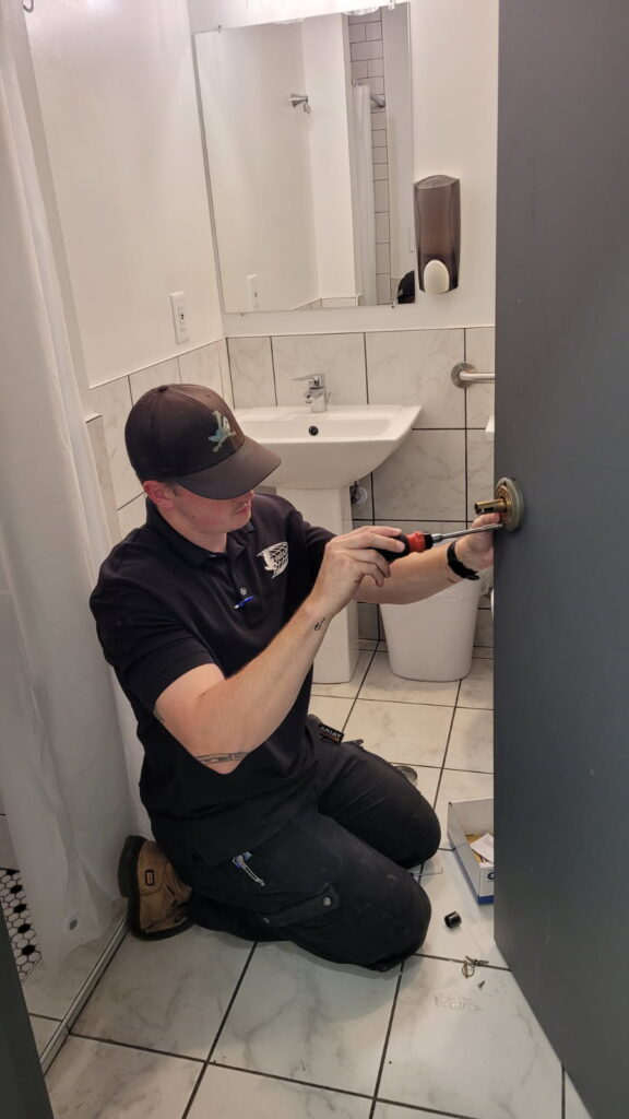 Along with the new doors, we also installed new hardware. For the bathrooms, this includes an indicator deadbolt. Indicator locks are a fantastic option for single-occupancy bathrooms in all types of buildings. In addition to ease of use, it also reduces wear on the hardware because individuals in the hallway can clearly see the room is in use and aren’t pulling on the lever unnecessarily.